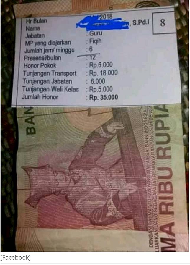 Total sebulan guru ini mendapatkan upah yakni Rp 35.000. Foto gaji honorer itu banyak beredar luas di media sosial.
